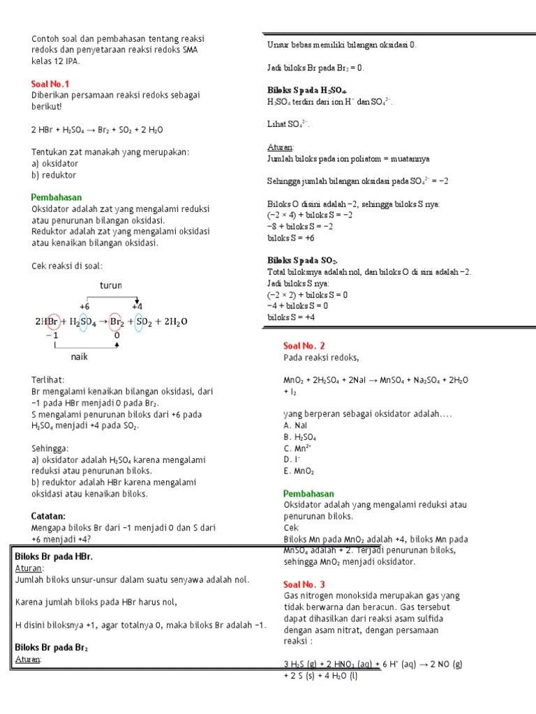 Soal un kimia 2019 no. 40 soal latihan reaksi redoks serta pemahasannya jempol kimia from . Suatu reaksi oksidasi biasanya disertai dengan reaksi reduksi sehingga . Contoh soal analisis terkait persamaan reaksi redoks. Contoh soal pembahasan penyetaraan redoks bag ii.